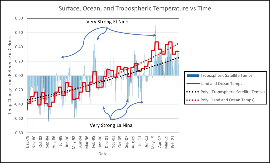 The graph to the left is derived from published NASA surface and atmospheric temperature data. The data in blue is globally collected satellite data for tropospheric temperatures: the atmospheric layer from the surface of the Earth to the base of the stratosphere. The y-axis is the monthly change in temperatures from the 1991-2020 average. Some of the large spikes in temperatures are attributed to exceptionally strong El-Nino or La Nina events–in other words, weather rather than climate. El-Nino generally is responsible for warmer than normal temperatures while La Nina generally leads to cooler than normal temperatures. There is a broad concurrence between the satellite and surface temperature collected data with both showing a slight cooling from 2015 to present day, but it is probably too soon to call this a long-term trend. The stall in temperature increase is curious and may be related to the removal of CFCs from the stratosphere.