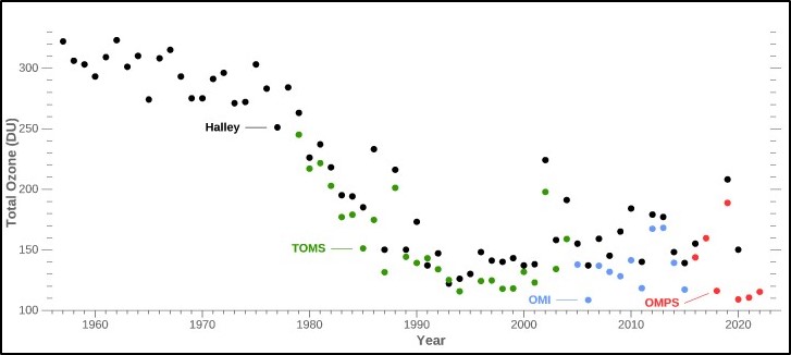 The black solid line on the graph above is the lowest yearly minimum Dobson Unit/km values. Lower Dobson values equate to larger ozone losses. The lowest yearly Dobson minimum represents the maximum ozone loss for that year. The yearly minimum Dobson values usually occur in Antarctica spring months of September through November. Higher or lower Dobson values do not display a significant correlation with the stratospheric temperature spikes except they both occur in the springtime suggesting other variables are at play. The other factors may include water vapor and ice, nitric acid, Chinese abrogation of the Montreal Protocols… The black dotted line is a polynomial fit to Dobson data and suggests that beginning in the early 2020s the ozone hole started increasing in size again. The ozone scientific community says it is closing.