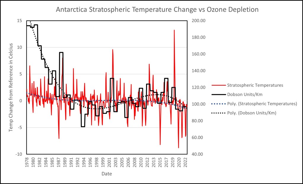 The graph to the right shows the south pole stratospheric temperature and Dobson NASA satellite derived data. The solid red line shows the temperature difference from the 1991-2020 monthly average. The dotted blue line is a polynomial fit to the temperature data that exhibits a slight cooling trend from 1979 through 2022. The temperature spikes, negative and positive occur during the Antarctic spring months of September through November. The temperature spikes usually come in pairs. A large negative value temperature spike in the Antarctic spring is generally followed by a large positive value temperature spike in the spring of the following year. This duality of temperature pairs seems paradoxical or at least inexplicable. The answer is not readily apparent but may lie in the fact that CFCs not only destroy ozone but are also powerful greenhouse gases. More powerful than CO2, methane, and laughing gas but less so than water vapor. In the cool spring years additional CFCs may be concentrated and stored in the stratosphere provoking a feedback loop with solar radiation that raises stratospheric temperatures the following spring. More on this below but this hypothesis is just an unsupported conjecture at this point. A noticeable exception to this observation is the three large negative temperature spikes in 2020, 2021, and 2023 which were not followed by corresponding positive spikes. Is this evidence of the removal of CFCs from the stratosphere causing less heat to be trapped there?