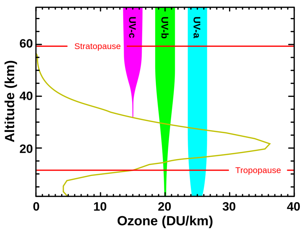 The graph to the left shows the relative amounts or intensity of the three flavors of UV radiation that pass through the Earth’s atmosphere. The vertical axis on the graph is height above sea level while the horizontal axis measures the amount of ozone in Dobson units per kilometer (DU/km) in the atmosphere. The yellowish curve trending sideways on the graph shows the relative density of ozone in the atmosphere. The outline of the yellowish curve is essentially the ozone layer, with its densest O3 concentration between 20-25 kilometers above the surface of the Earth. UVC in purple is filtered out by O2 and is essentially removed before it even reaches the top of the ozone layer. UVB in green is dramatically reduced as it passes through a healthy ozone layer. The greater the density of the ozone layer the greater the reduction in UVB radiation. UVA rays experience very little reduction in intensity or amount as they traverse the atmosphere.