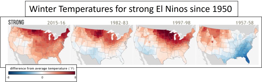 This year’s El Nino was driven by a larger than normal spike in Pacific Ocean temperatures that were about 0.5-degree Fahrenheit above 2022 temperatures. This is considered an exceptionally large increase. This has led to warmer, dryer winters in the upper mid-western states of the U.S. along with greater precipitation in the western U.S.