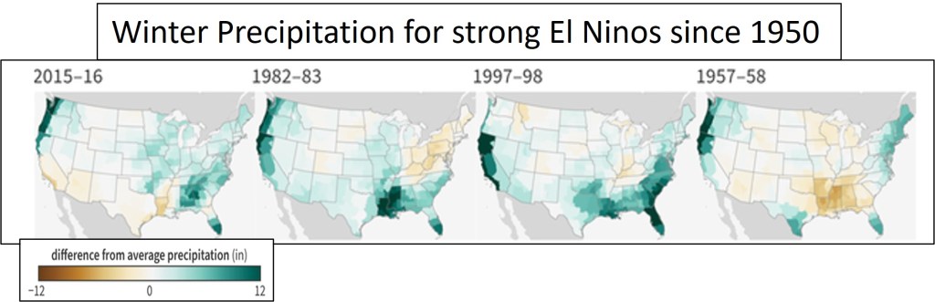 The graph below, again from NOAA Climate.gov, shows winter precipitation during strong El Ninos since 1950. In Long Beach, California the 1997-1998 winter brought 17.77 inches of rain whereas the winter of 2023-2024 has already brought 13.88 inches of rain with 19 days left in the month of February to add to that total. This year’s winter precipitation in Long Beach should be similar to what occurred in the 1997-1998 winter season.