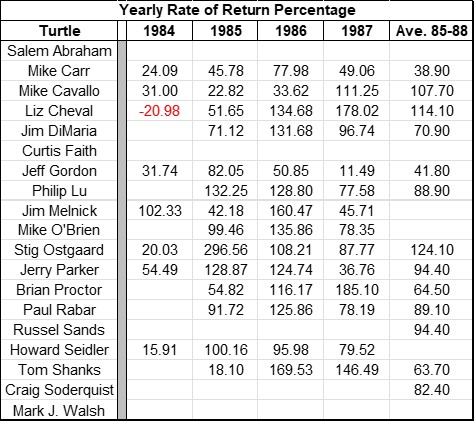 It was a simple system and it worked exceptionally well for the ‘Turtles’ who collectively made profits of $175,000,000 over the 5 years they worked for Dennis’s firm. The spreadsheet to the right shows the individual ‘Turtle’ results while they were working for Dennis (source: Covel and the Wall Street Journal – not all ‘Turtles’ listed)