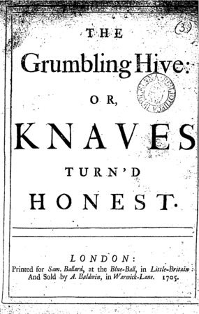 1714 The Fable of the Bees: or, Private Vices, Public Benefits. Printed and sold by J. Roberts, London