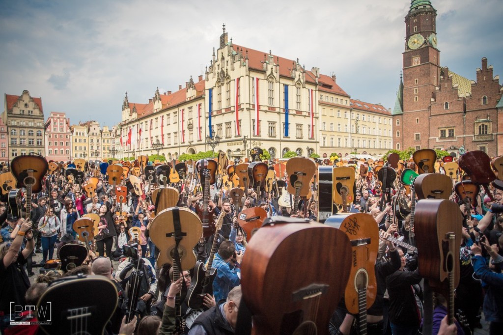 The gig’s history goes back to a Blues Express workshop in 1997 where Leszek Cichonski, a Polish blues guitarist, found himself on stage with 17 other guitarists playing “Hey Joe” thus providing the incentive to answer the theological question of how many guitarists can fit into Wroclaw, Poland’s Main Market Square on the first day in May every year. Below is a list of the records, which, apparently, always need to be broken because the theological limit hasn’t been reached yet.